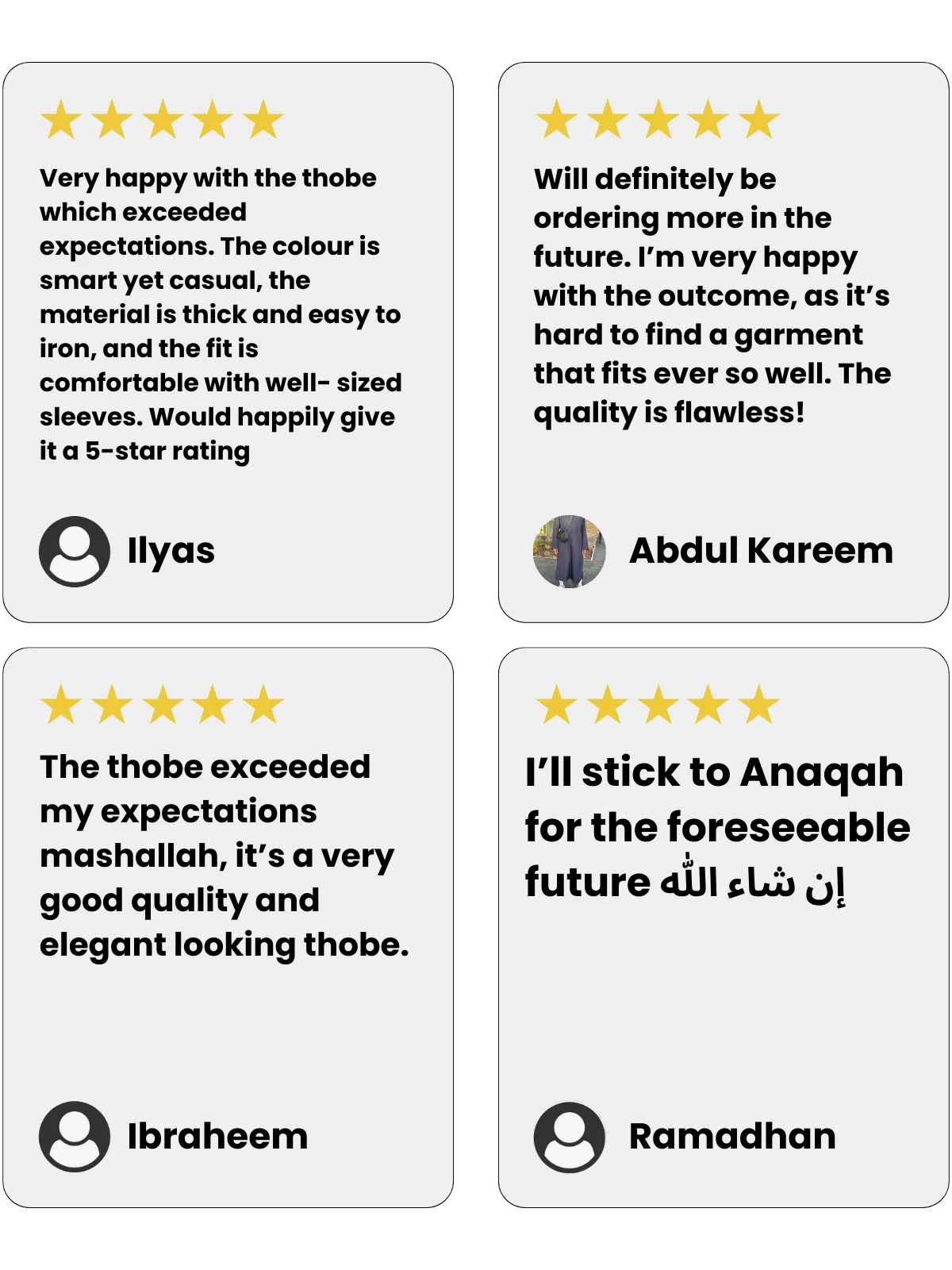 With Anaqah, all we need is your height and UK shirt size and we'll craft a thobe that fits you effortlessly insha Allah.